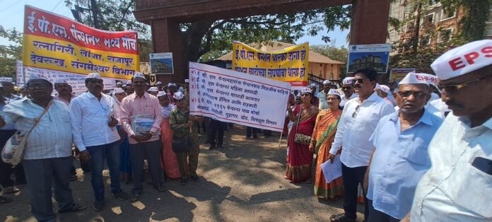 रत्नागिरी:- ईपीएस १९९५ अंतर्गत पेन्शन घेणाऱ्या नागरिकांनी आपल्या विविध मागण्यांसाठी आज रत्नागिरी येथे मोर्चा काढला. शहरातील प्रमुख मार्गांवरून निघालेला हा मोर्चा जिल्हाधिकारी कार्यालयावर धडकला. त्यानंतर जिल्हाधिकाऱ्यांना सविस्तर निवेदन देण्यात आले.