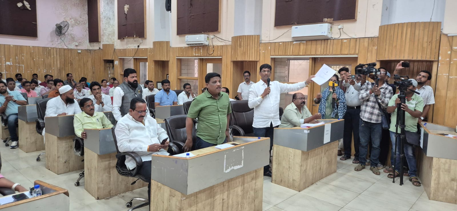 उपनगराध्यक्ष समीर तिवरेकर यांनी बांधकाम अभियंता पहिल्याच सर्वसाधारण सभेला गैरहजर असल्यावरून प्रश्न उपस्थित केला. पहिल्याच सभेला सर्व खातेप्रमुख आणि कर्मचाऱ्यांनी राहण्याचे आदेश नगराध्यक्ष यांनी दिलेले असताना बांधकाम अभियंता गैरहजर कसे असा सवाल समीर तिवरेकर यांनी मुख्याधिकारी यांना केला. यावेळी मुख्याधिकारी यांनी संबंधित अधिकाऱ्यांची रजा मंजूर करण्यात आली नसल्याची माहिती सभागृहाला दिली. यानंतर नगरसेवक अधिक आक्रमक होत बांधकाम अभियंता यांची रजा नामंजूर करून कारवाई देखील झाली पाहिजे अशी आक्रमक मागणी केली.